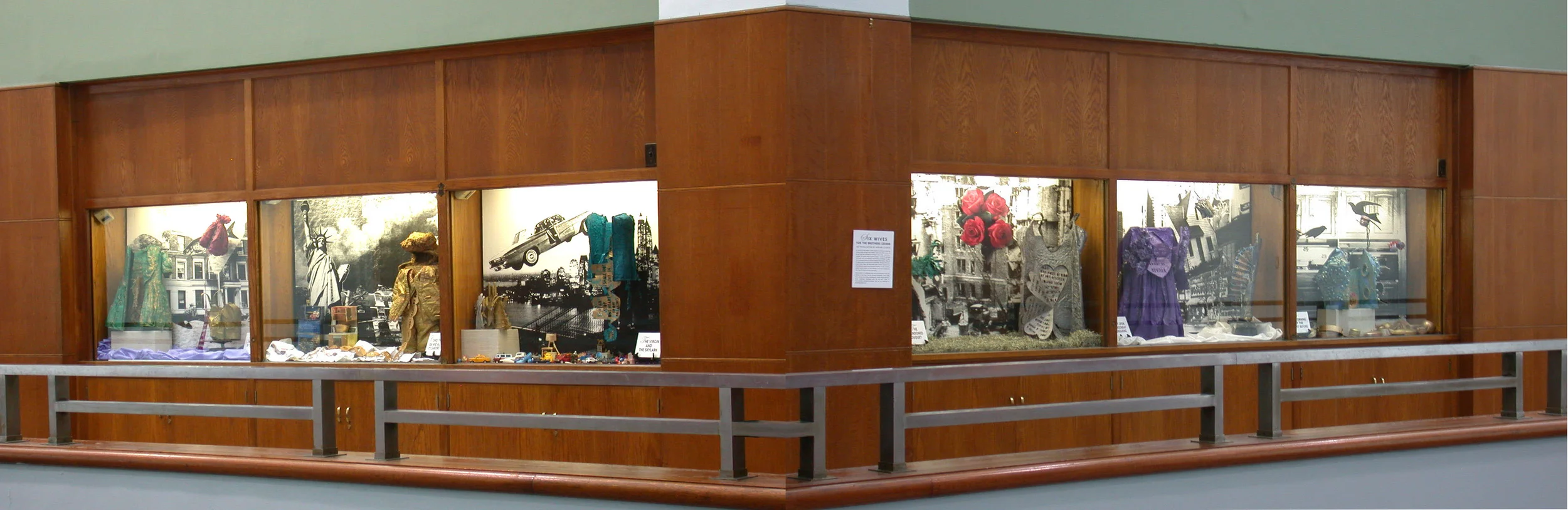 Six Wives for the Brothers Grimm presents six dioramas exploring themes raised by Jakob and Wilhelm Grimm and other sources of fairy and folk tales. Designed for Brooklyn’s urban, plural environment, the panels depict sculptural figures I created by applying traditional and non-traditional bookbinding techniques to pigment-stiffened articles of clothing embedded with objects. Many of the figures open to reveal one-of-a-kind books and additional objects. Serving as the characters’ inner voices, the hand-made books contain excerpts from Emily Dickinson poems about the personal tragedies, usually romantic, people secretly endure. The lettering in the texts is all hand-cut, reflecting the fragility of their expression.
